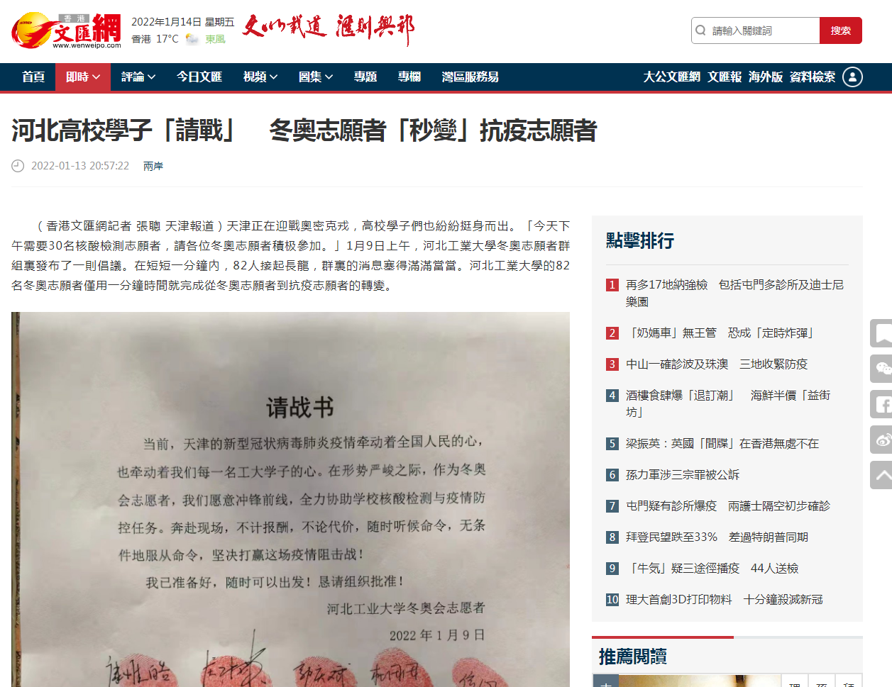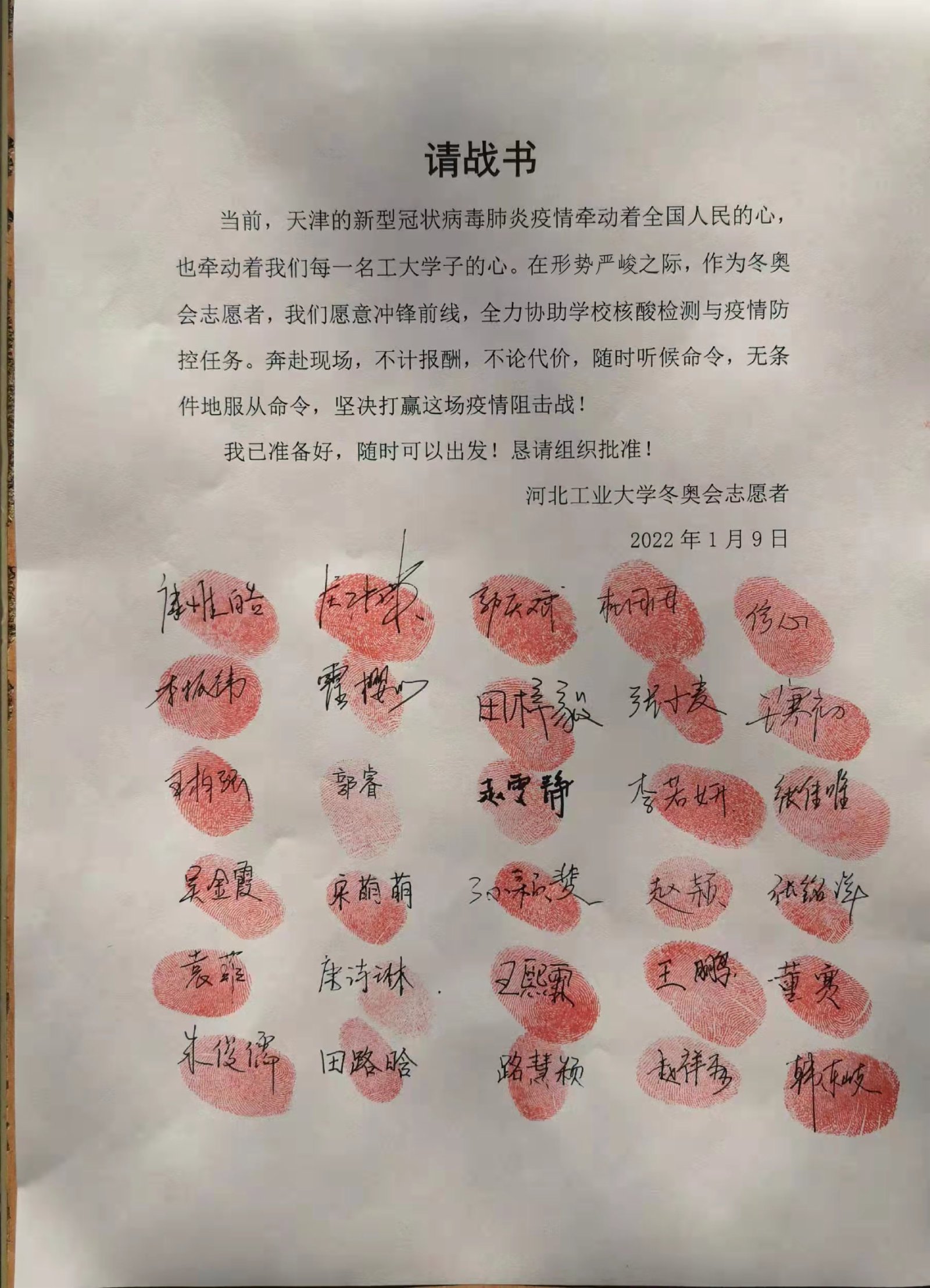 「當前,天津的新冠病毒疫情牽動着全國人民的心,在形勢嚴峻之際,作為冬奧會志願者,我們願全力協助學校核酸檢測與疫情防控任務。,我們請求衝鋒前線,全員上陣,貢獻更多志願力量,奔赴現場,不論代價,隨時聽候命令,無條件地服從命令,堅決打贏這場疫情阻擊戰。」少年意氣、家國情懷都化作一紙請戰書。