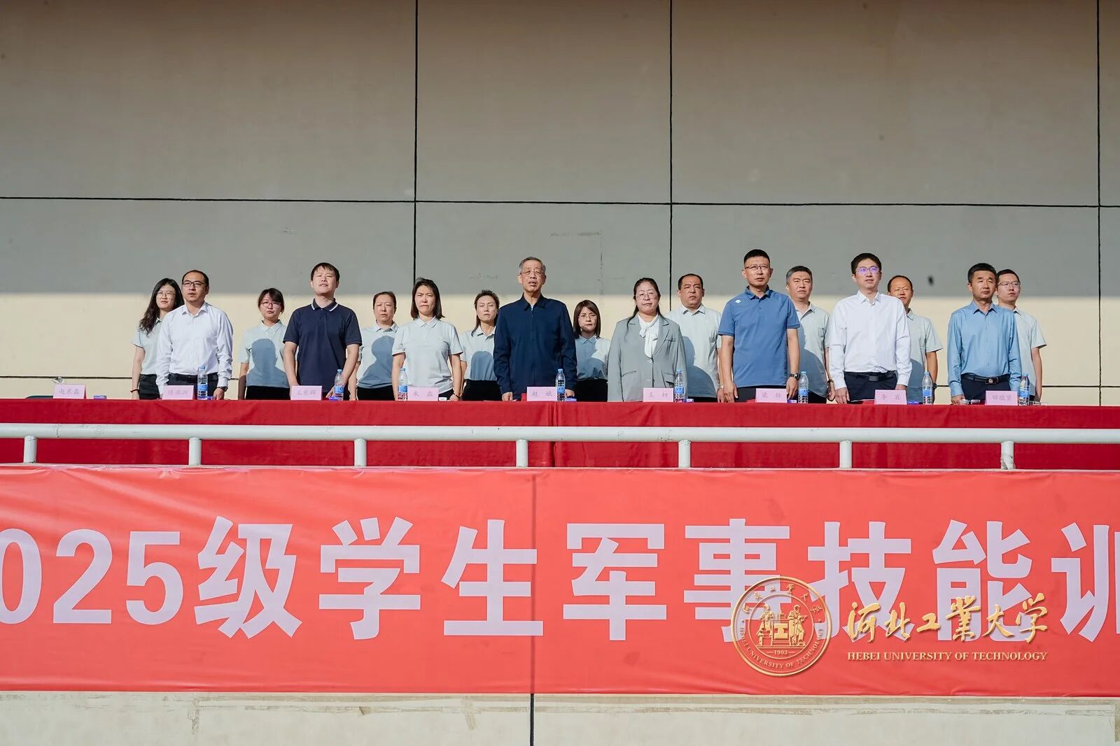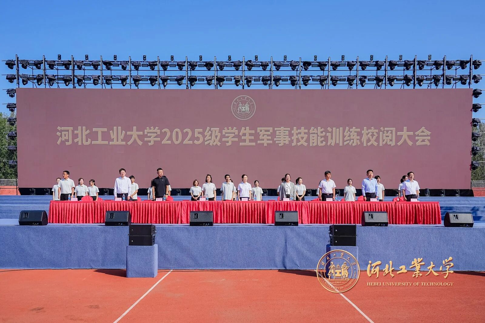 风拂征衣秋意爽,军姿如柏气轩昂。9月20日上午,英国365集团公司官网2025级学生军事技能训练校阅大会在红桥校区东院操场与北辰校区体育中心相继举行。校党委副书记赵斌,校党委常委、副校长陈鸿雁出席大会。校内各单位、部门负责同志,各学院军训工作领导小组负责人、承训教官、2025级学生辅导员和2025级全体本科生参加大会。
