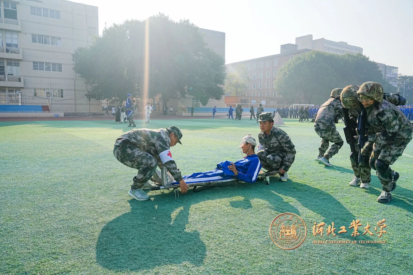 救护人员反应迅速、操作规范,熟练完成伤员转移、急救处理等流程,既体现了军训的实战化特色,也展现了学生与教官们的应急处置与协同配合能力。