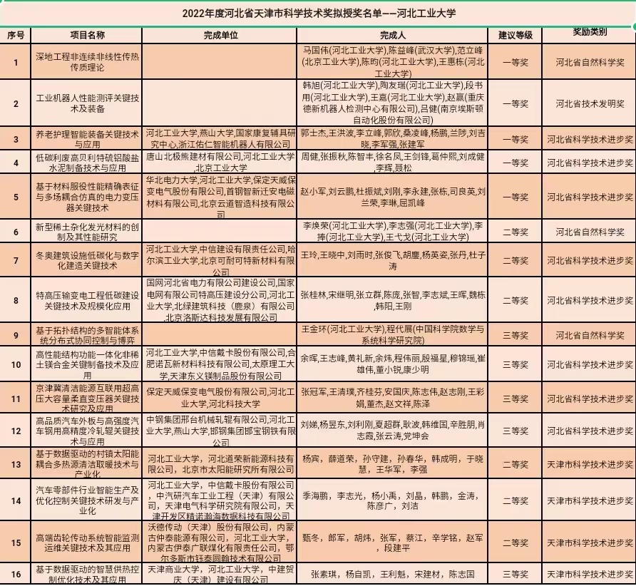 近日,天津市和河北省先后公布了2022年度科学技术奖拟授奖名单,我校再创佳绩,共有16项成果获奖。在天津市科学技术奖拟授奖名单中,我校4项成果赫然在列,其中二等奖3项(我校作为第一完成单位2项),三等奖1项。根据河北省科学技术奖的总评结果,我校获得河北省科学技术奖12项,其中一等奖5项(我校作为第一完成单位3项),二等奖3项(我校作为第一完成单位2项),三等奖4项(我校作为第一完成单位2项),实现了我校三大奖种一等奖大满贯,在河北省高校中,获奖总数及一等奖获奖数量排名均位居榜首。