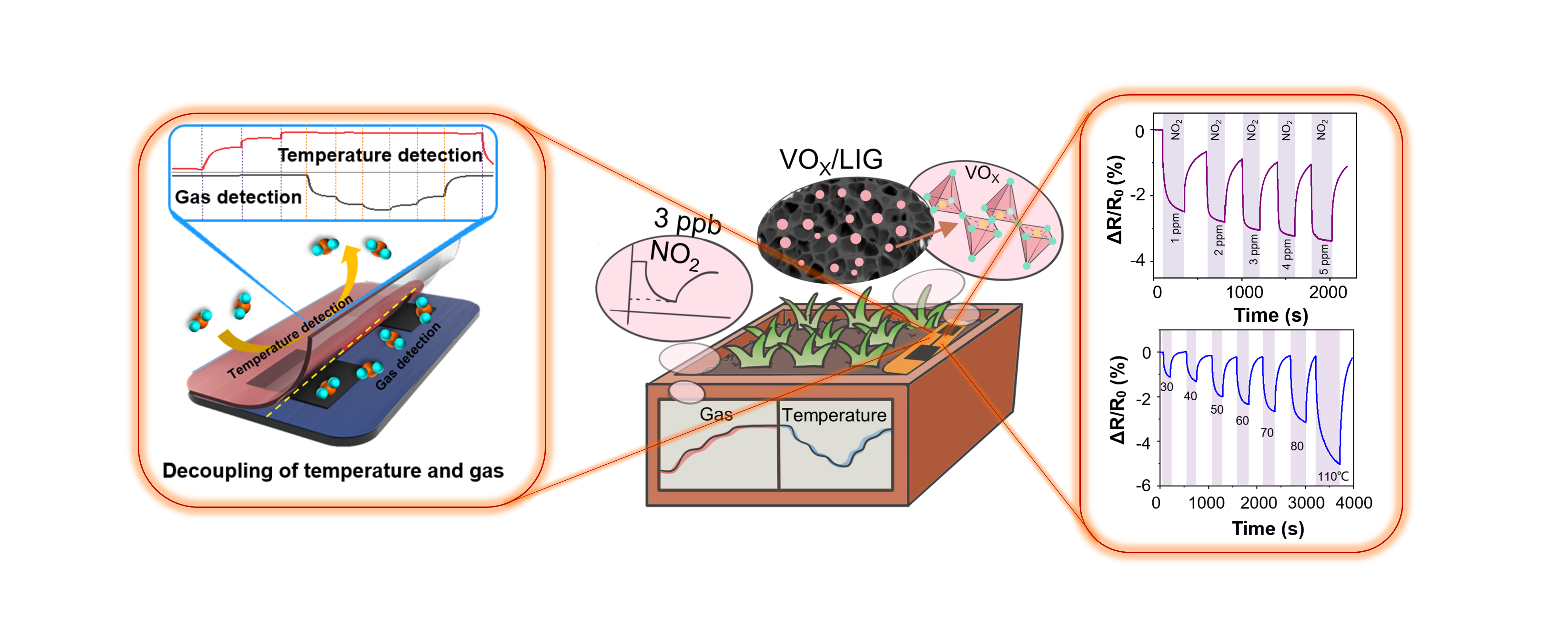 采用激光直写技术,实现了激光诱导石墨烯(LIG)/氧化钒(VOX)纳米复合材料的原位制备,并同步构筑高性能气体—温度双参数柔性传感器。引入柔性高分子半透膜,提出了气体—温度双参数解耦策略。采用PDMS软膜对传感器进行封装,封装的传感器可以阻止气体分子的渗透,从而只对温度变化响应;未封装的传感器基于自加热的方式消除了温度变化的影响,可准确检测NO2气体。进一步集成微型数电采集模块、无线传输模块以及智能APP,实现了土壤环境氮流失和土壤温度的远程实时监测。该项研究将在智慧农业和人类健康监测的应用中发挥巨大潜力,该成果以“Vanadium oxide-doped laser-induced graphene multi-parameter sensor to decouple soil nitrogen loss and temperature”为题发表在《Advanced Materials》上。(DOI:10.1002/adma.202210322)。