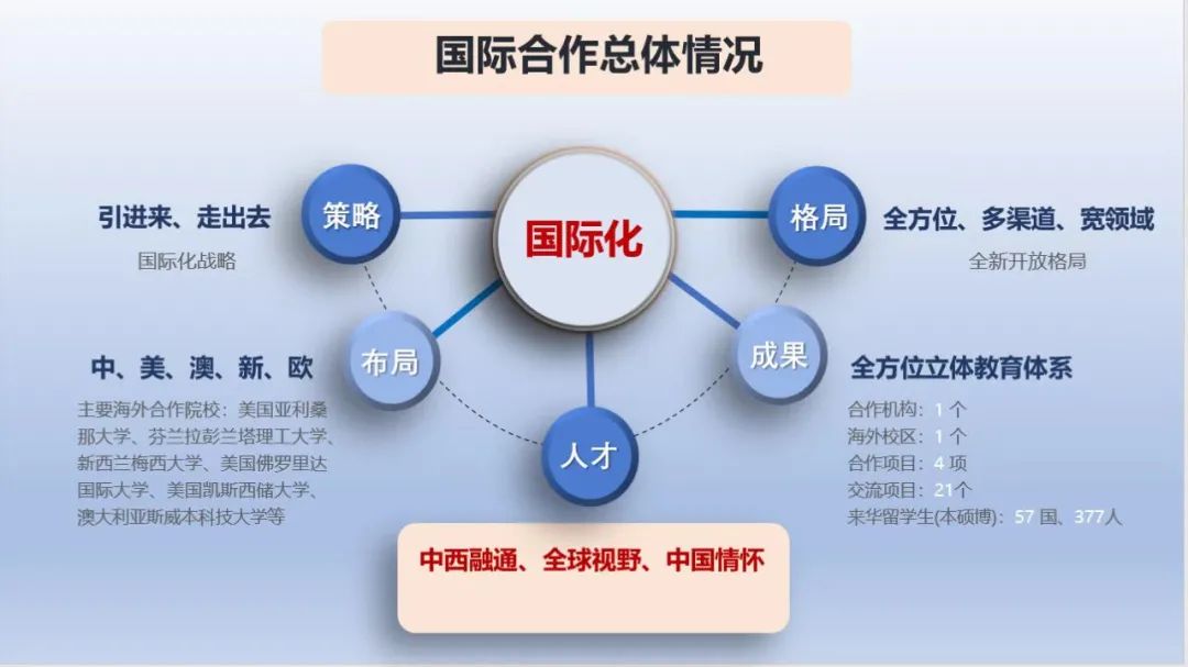 学校将继续坚持扎根中国与融通中外相结合,加快国际化战略布局,扩大对外开放,提升国际化办学效能,不断加强师资建设国际化、人才培养国际化、科研合作国际化,全面提升国际化办学水平,构建全方位开放合作的办学治校新格局,不断提高国际声誉。