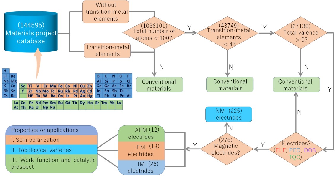 张小明教授、刘国栋教授与昆士兰科技大学寇良志教授等,历时近一年完成对磁性拓扑电子化合物的高通量材料筛选,从材料数据库中超过14万种材料出发,结合多种判断手段,共筛选出276种电子化合物,其中51种展现出铁磁、反铁磁与间隙磁性。此外,对所有磁性拓扑电子化合物的电子结构、拓扑物质态、功函数等性质进行了系统研究,并发现它们在电子发射器、促进催化氨合成等领域比惯常材料具有显著的应用优势。该工作是国际上首个对磁性拓扑电子化合物的材料筛选、物性与应用全方面系统性地研究工作,于2023年2月23日在国际顶级期刊Journal of the American Chemistry Society (DOI: 10.1021/jacs.3c00284)上在线发表。该成果第一作者为张小明教授,我校博士研究生孟维真为共同第一作者,刘国栋教授和昆士兰科技大学寇良志教授为论文通讯作者。