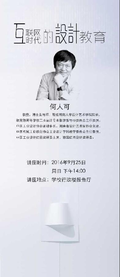 讲座题目:互联网时代的设计教育 讲座时间:9月25日下午14:00 讲座地点:学校行政楼报告厅 讲座人:何人可 主讲人简介: 何人可,教授,博士生导师,现任湖南大学设计艺术学院院长,教育部高等学校工业设计专业教学指导分委员会主任委员,中国工业设计协会副理事长,湖南省设计艺术家协会主席,中国机械工业教育协会工业设计学科教学委员会主任委员,中国工业设计红星奖评委主席,德国红点设计奖评委。 欢迎广大师生莅临参加!