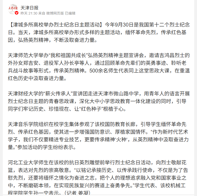 9月30日,《天津日报》在其微博客户端发布报道“津城多所高校举办烈士纪念日主题活动”,其中我校师生在校内抗日英烈雕塑前举行了纪念活动,深切缅怀革命先烈。